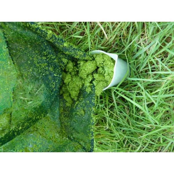 Selon la dispersion des lentilles, le SKIMCRUSH permet d'aspirer 50 à 400 l de lentilles à l'heures. pour calculer le nombre de big-bag nécessaires, il faut réaliser un prélèvement de surface avec une petite épuisette (ex:25 x 25 cm) et mesurer le volume de lentille prélevée, puis de faire les calculs pour rapporter ce résultat en fonction de la surface (X16 pour cette taile d'épuisette), plusieurs prélèvement peuvent être nécessaires si le vent à concentré les lentilles sur un bout de la pièce d'eau.