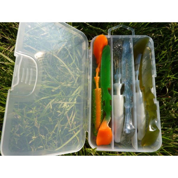3 Shads articulés de 14 cm pour le bar, le lieu, le brochet ou autres carnassiers. S'utilise avec une monture ARMORVIF 12 à 40 g ou la tête plombée de votre choix.